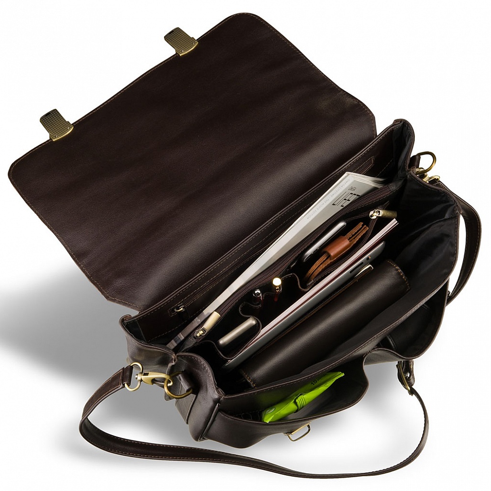 Солидный, прочный портфель широкого раскрытия для огромного количества бумаг и документов. Модель солидного, дорогого вида с продуманным расположением многочисленных отделений и карманов. Их количество дает владельцу возможность раскладывать документы и папки комплектами, в удобном для себя порядке. Обилие кожи производит впечатление с первого взгляда, при прикосновении она непередаваемо приятна. Надежное крепление основной ручки и съемного плечевого ремня. Портфель классический, не подверженный перепадам моды, создан для долгого использования.