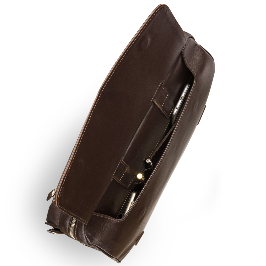 Серьезная, основательная сумка с тремя отделениями. Объемный карман на магнитных застежках. Огромное количество деловой документации, ноутбук и масса необходимых мелочей - все поместится. В первом отделении – гнезда для мобильного телефона, визиток, ручек, записной книжки, во-втором отделении (центральном) разместился отсек для ноутбука, в третьем – карман на молнии для важных мелочей.