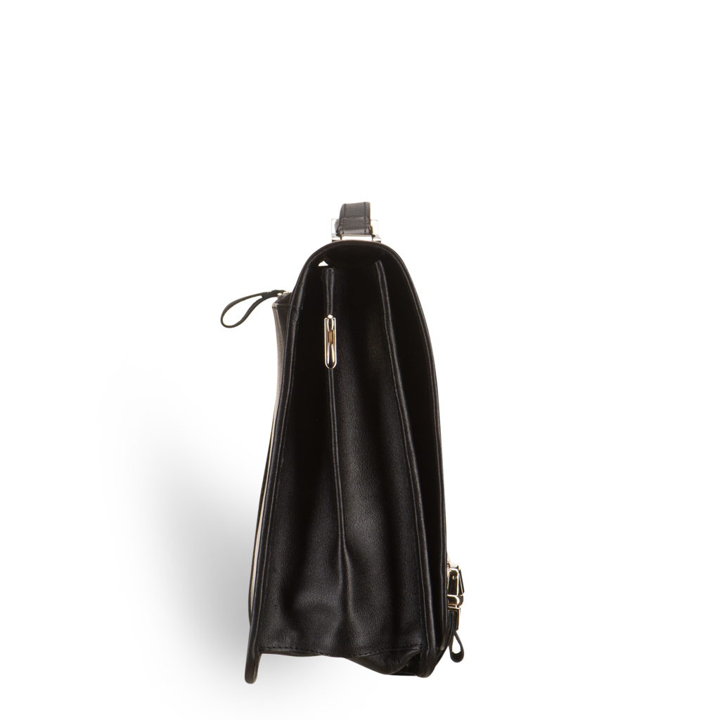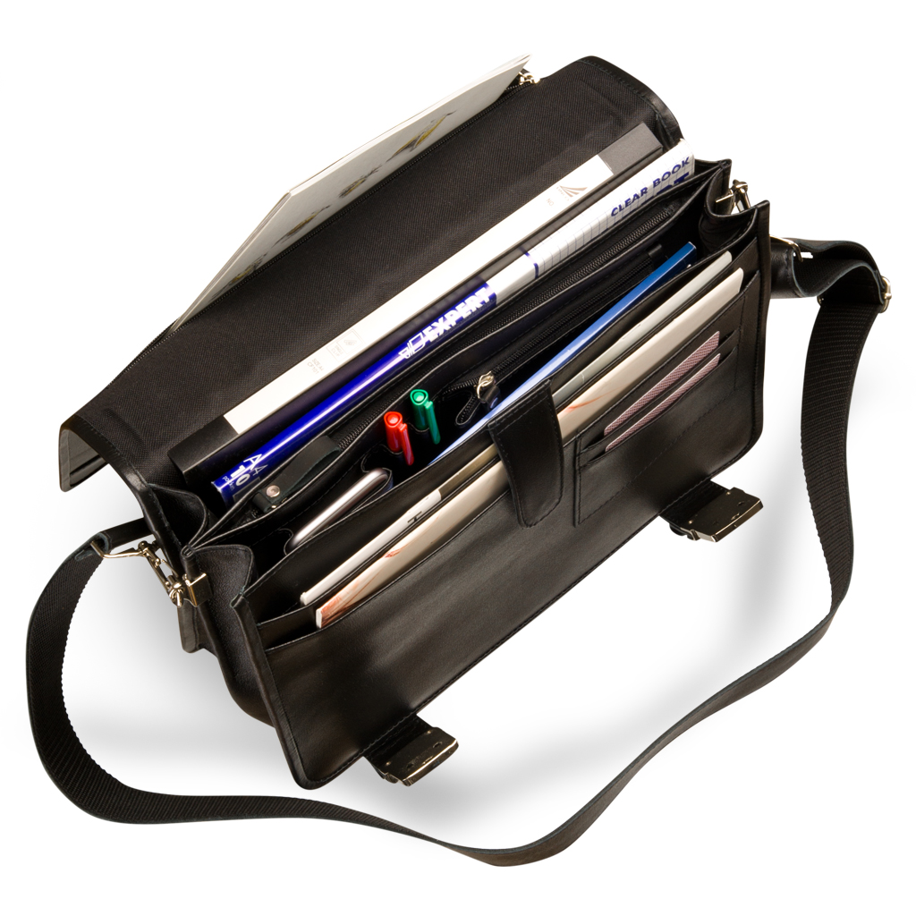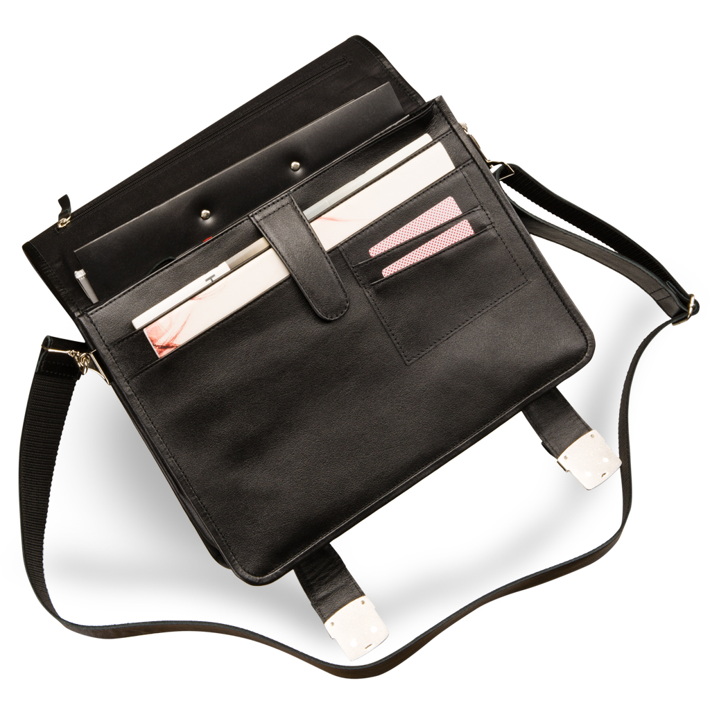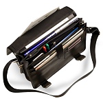 Портфель с двумя отделениями. Классический объемный портфель для делового мужчины, где Вы удобно сможете разместить все необходимое на каждый день. Два отделения, между ними жесткий карман для документов, в первом нет карманов и молний, он создан для документов и ноутбука, второй содержит бизнес-блок: карман на молнии для бумажника, открытый карман для телефона, два гнезда для письменных принадлежностей. На внутренней стороне клана размещён широкий карман на молнии. Под клапаном на лицевой стороне два открытых отделения, закрываются кожаным магнитным хлястиком, два кармана под визитные карточки. На задней стороне дополнительный карман на молнии. Удобная анатомическая ручка. Для удобства ношения в комплект входит кожаный плечевой ремень с двумя карабинами-застежками и ключ для замков.