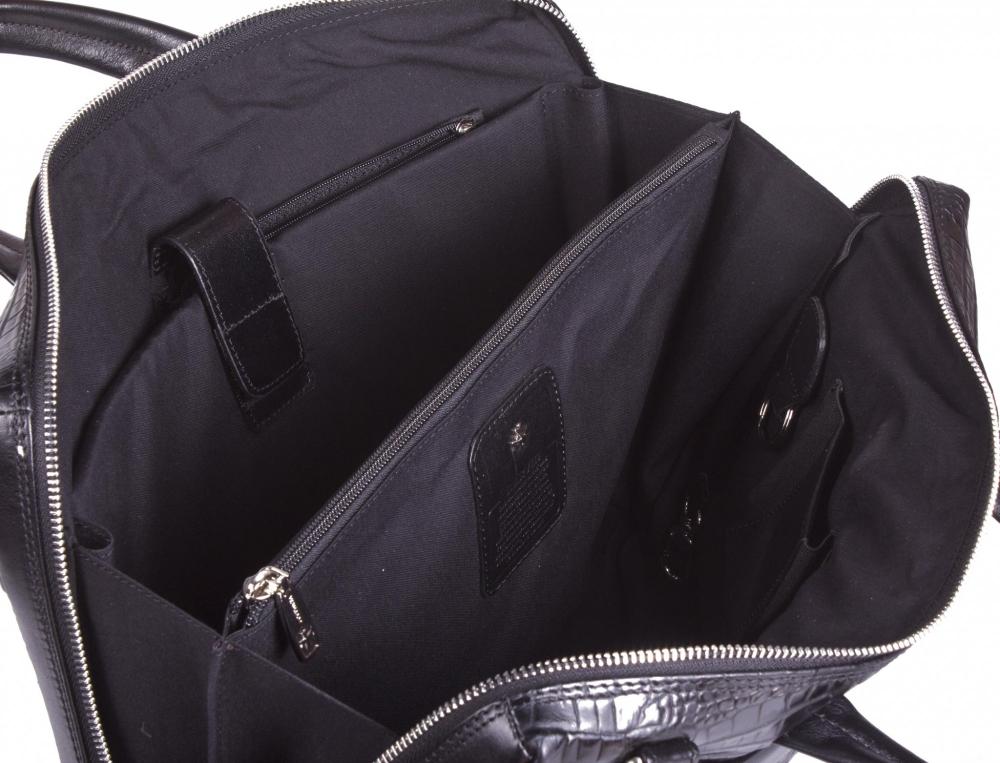сумка из натуральной телячьей кожи, закрывается на металлическую молнию. Снаружи, с каждой стороны изделия, отделение на молнии и карман на металлической молнии на лицевой стороне. Внутри два основных отделения и одно дополнительное на молнии, карман для планшета (ноутбука) с дополнительной защитой, который закрывается кожаным хлястиком на липучке; кожаные кармашки для ручек, телефона, айфона, карман на молнии, который можно использовать для ipad или для мелочей, кожаный брелок на кнопке с кольцом для ключей. В комплекте плечевой регулируемый кожаный ремень.