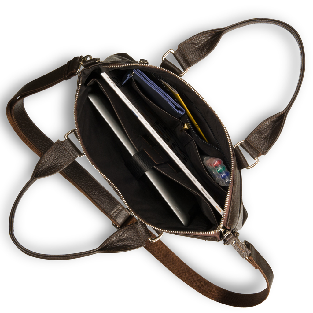 Внутри: карман на молнии для документов, два открытых паза для мобильного телефона и бумажника, отсек для бумаг форма А5 (закрывается лентой Velcro)