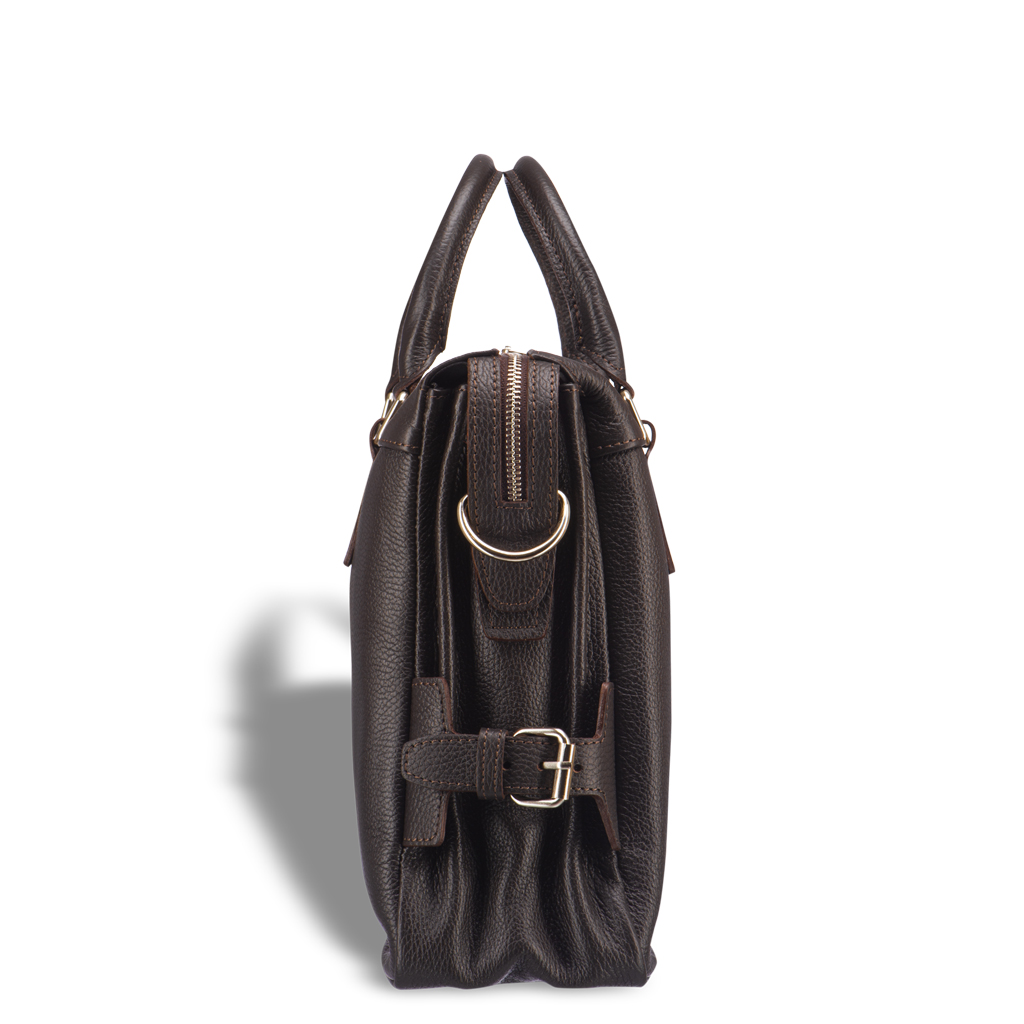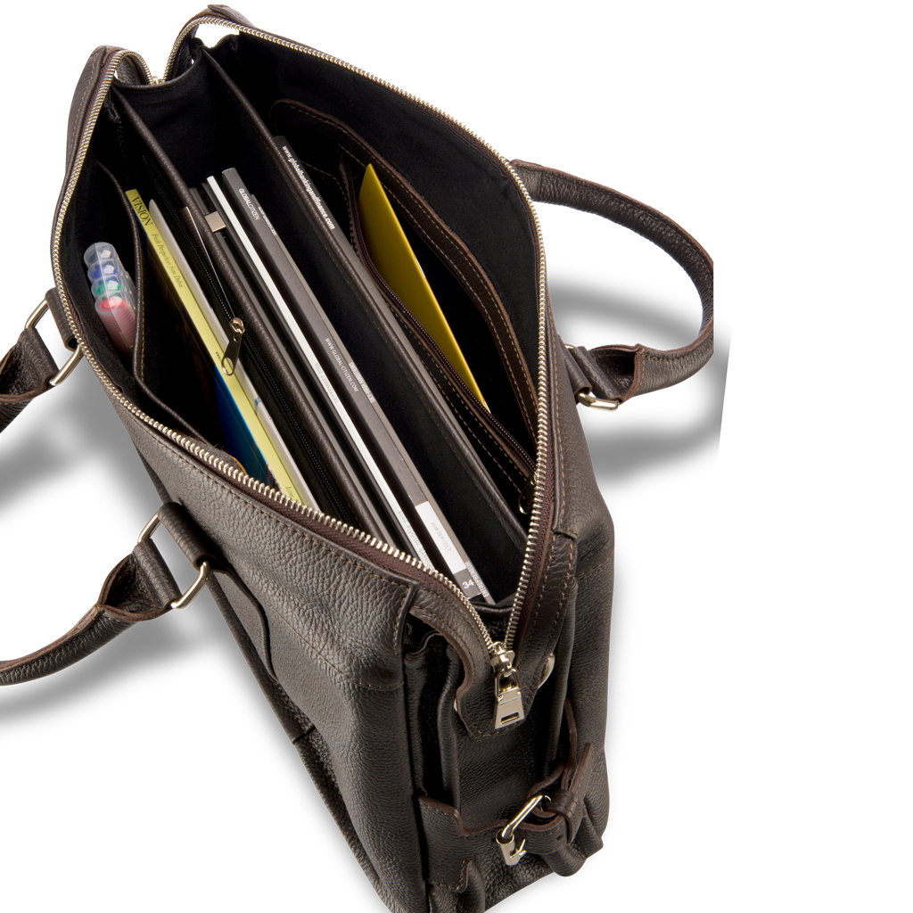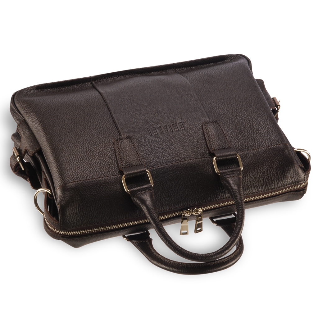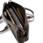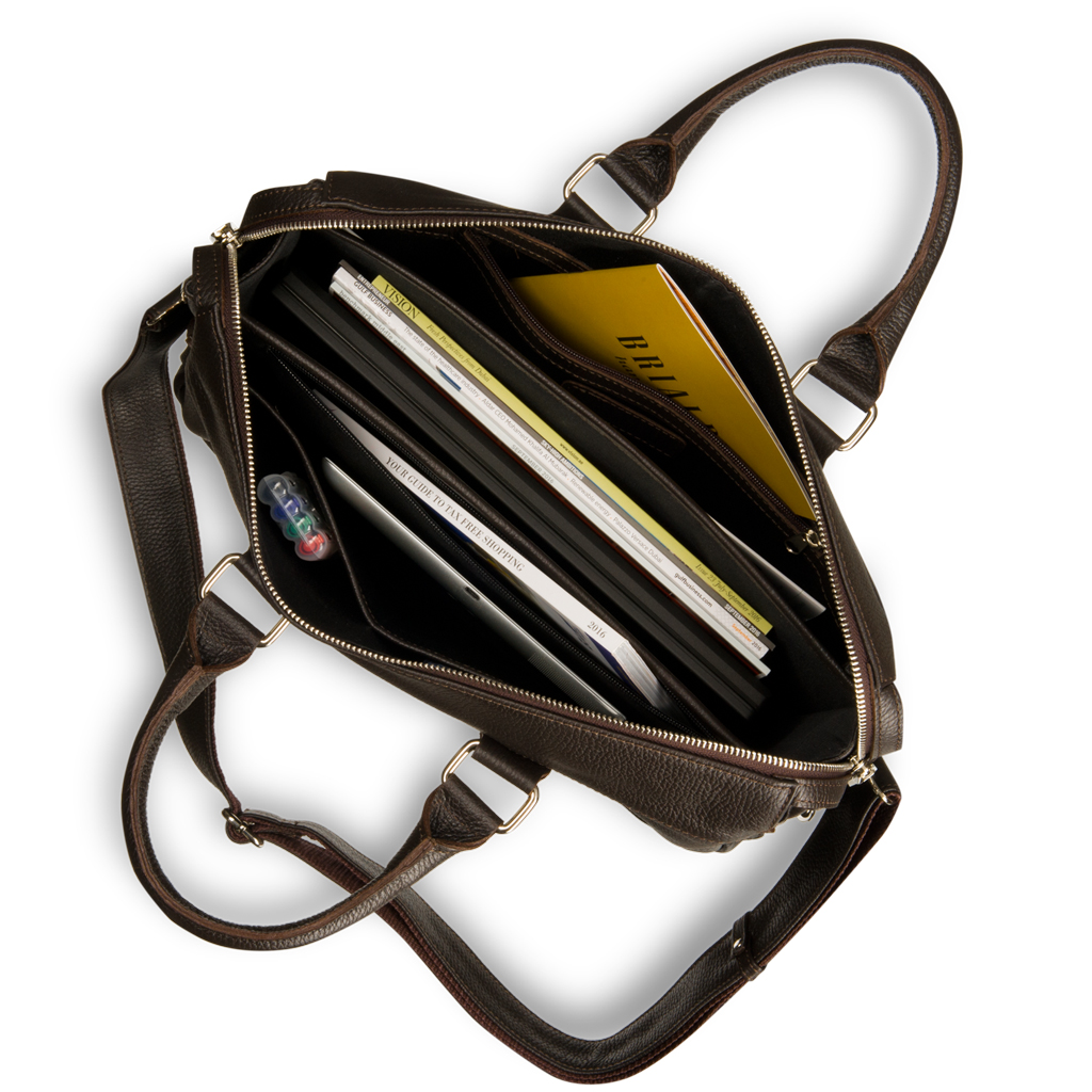 Солидная мужская сумка для трудоголиков. Убеждает в своей необходимости и внешним видом и содержанием. А содержать он может не только бумаги, но и ноутбук с диагональю до 13,3” дюймов. Среднее отделение – с жесткими стенками – подходит для этого идеально. Наружных карманов нет, зато внутри целых три отделения, разделенных жесткими перегородками, как сказано было выше – центральное отделение для ноутбука, два боковых для бумаг формата А4, так же имеется карман на молнии для особо ценных вещей, два открытых кармана для портмоне и мобильного телефона. Структурированность внутреннего убранства поражает своей педантичностью. Внешность у портфеля – солидная, но вовсе не скучная. Интересной фактуры отличная кожа, утягивающие ремешки, оригинальные и надежные крепления плечевого ремня, жесткое дно и металлические упоры. А еще у него удобные ручки.
