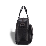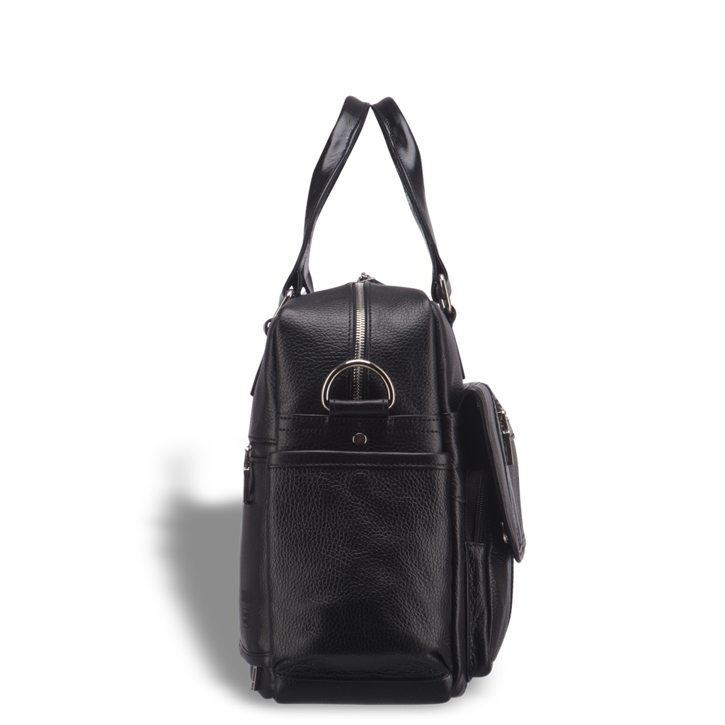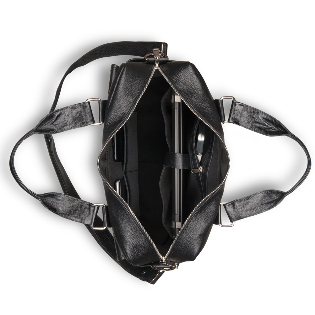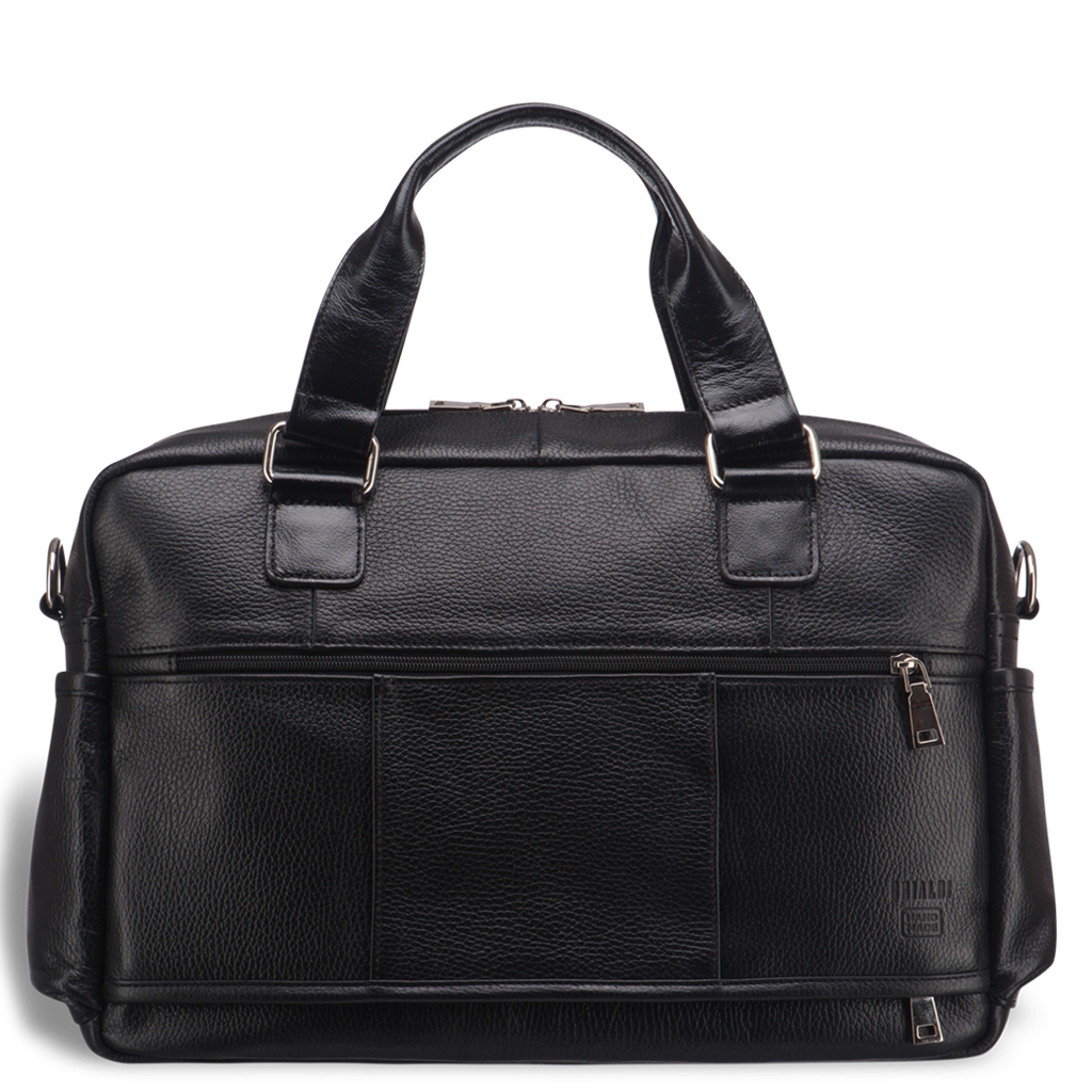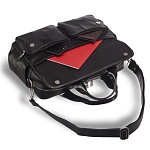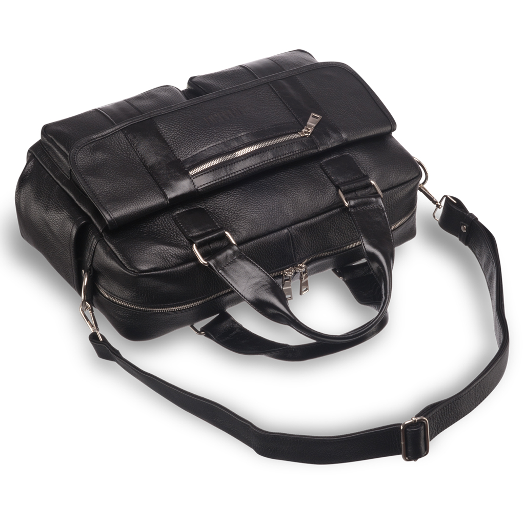 Сумка для документов для внушительных объемов. Ее внешний вид говорит о серьезности владельца. Много дел – много бумаг. Отдельно нужно остановиться на лицевой панели, т.к. здесь расположился полноценный органайзер из отделений и карманов: небольшой карман в клапанной крышке на молнии для ключей и проездных документов, под клапанной крышкой расположено отделение для бумаг, два кармана на молнии для важных мелочей повседневной жизни; на задней панели размещен сквозной карман на молнии, который можно использовать как крепление для сумки-тележки, что особенно удобно в командировках. Одно основное отделение закрывается на молнию, внутри: карман для бумаг формата А4, карман на молнии для документов, а так же два паза для записной книжки и мобильного телефона. Основное отделение просторное, здесь с легкостью поместиться ноутбук 15,6” дюймов. Съемный ремень крепится удобно, по бокам. Материалы отделки: натуральная кожа и современная прочная ткань.
