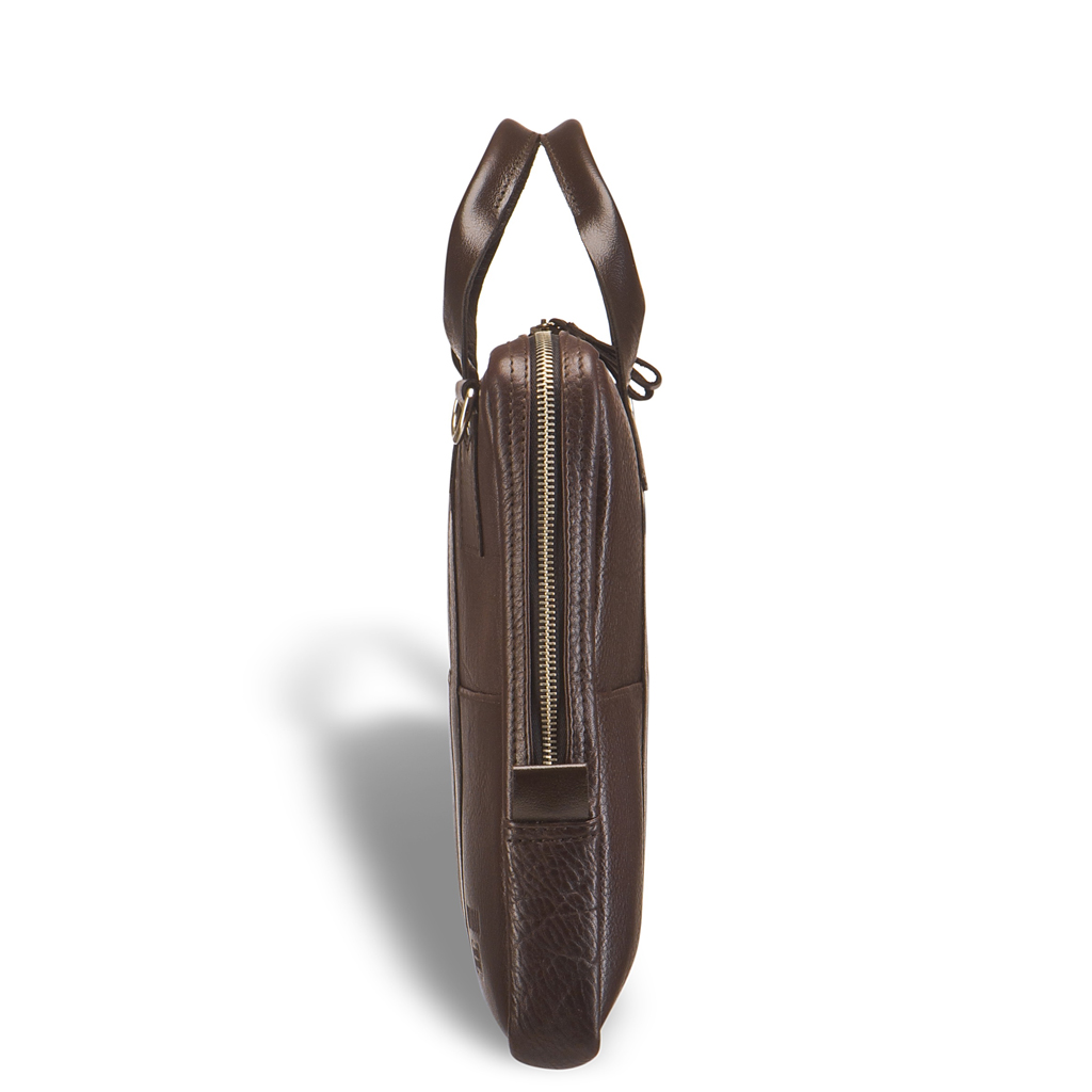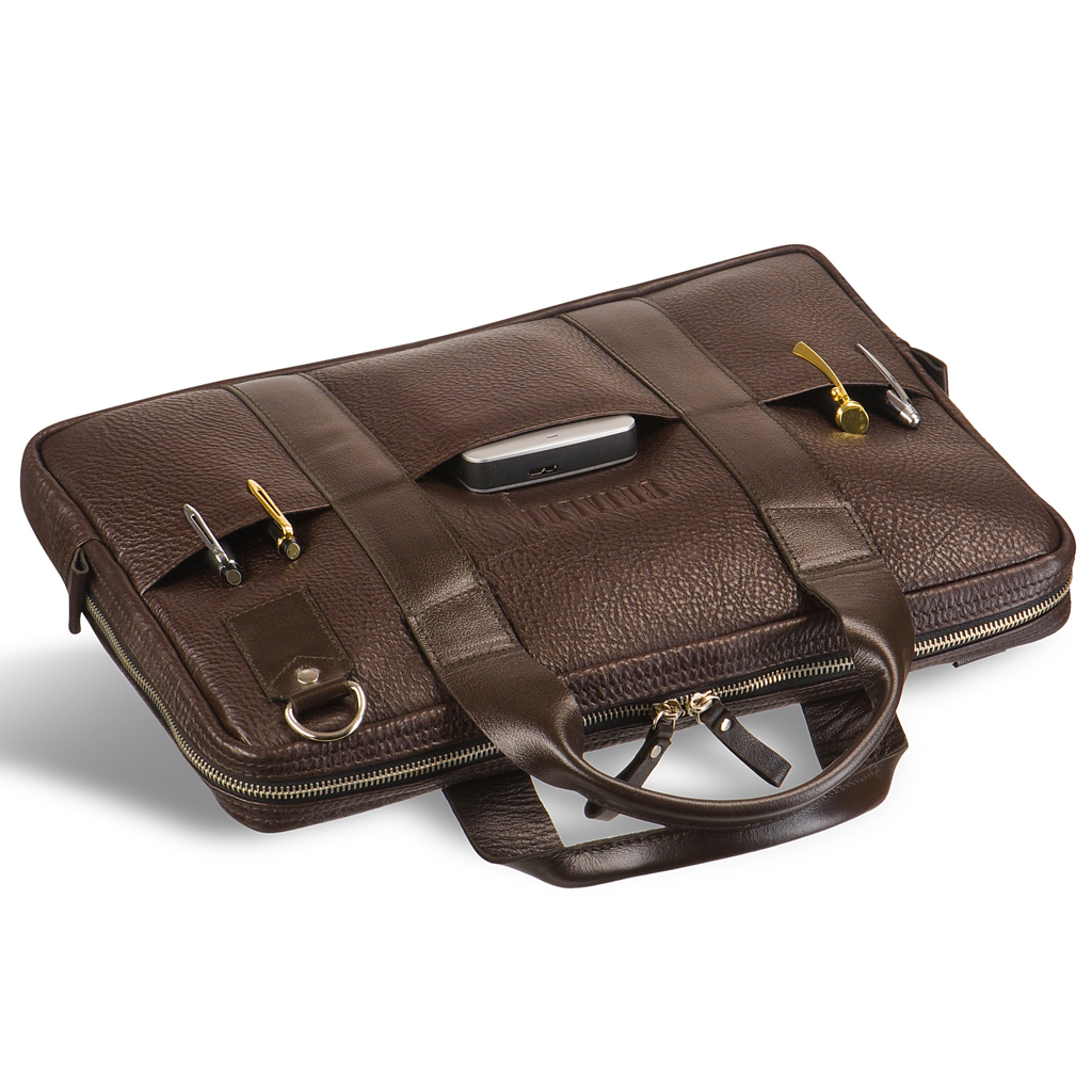 Современная стильная компактная сумка для документов. Маневренная благодаря подвижным, удобным, послушным ручкам. Выглядит стильно благодаря вертикальным кожаным лентам. Внутри вместительное основное отделение для документов формата А4, большой карман на молнии, открытый карман для ноутбука размером до 15,6” дюймов. На лицевой и задней панелях размещены по три кармана оперативного доступа:для телефона, записной книжки, важной мелочи. Плечевой ремень в комплекте.